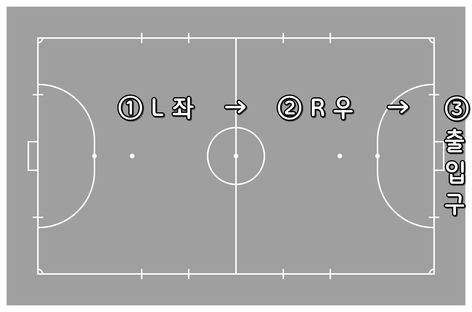 - 첫 경기는 'L 좌' 코트에서 하고 두번째 경기는 'R 우' 코트에서 치른 뒤 출입구 쪽으로 퇴장해 휴식/대기하는 순서